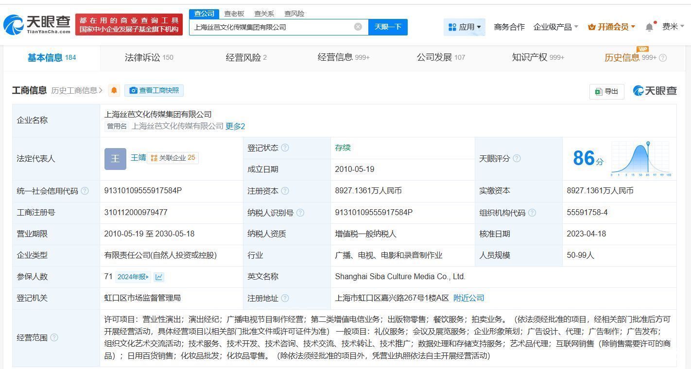 上海丝芭文化传媒集团有限公司成立于2010年5月,法定代表人为王靖,注册资本约8927万人民币,经营范围包括营业性演出、演出经纪、广播电视节目制作经营等,由王靖、上海星澈创业投资合伙企业(有限合伙)、北京创新方舟科技有限公司等共同持股。