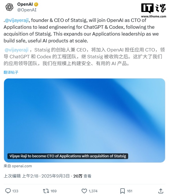 据 OpenAI 安排,Statsig 首席执行官 Vijaye Raji 加盟后将出任 OpenAI 应用技术负责人,负责推动公司在人工智能产品上的发展。